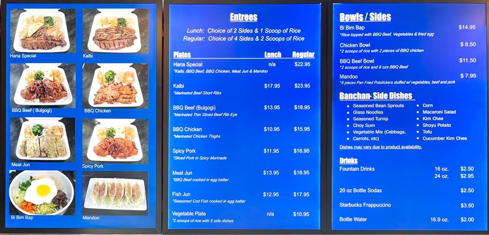 Welcome to Hana Korean BBQ, a delightful haven for Korean cuisine located on the top floor of the Kaleidoscope in Mission Viejo, California. This gem offers a menu brimming with authentic flavors and enticing options. The star of the show is the Hana Platter, featuring a wonderful mix of tender Kalbi, BBQ Chicken, and Spicy Pork, perfect for large gatherings. As echoed in customer reviews, the marinated meats are a must-try, particularly the bulgogi and kalbi, which many patrons rave about for their exceptional taste.